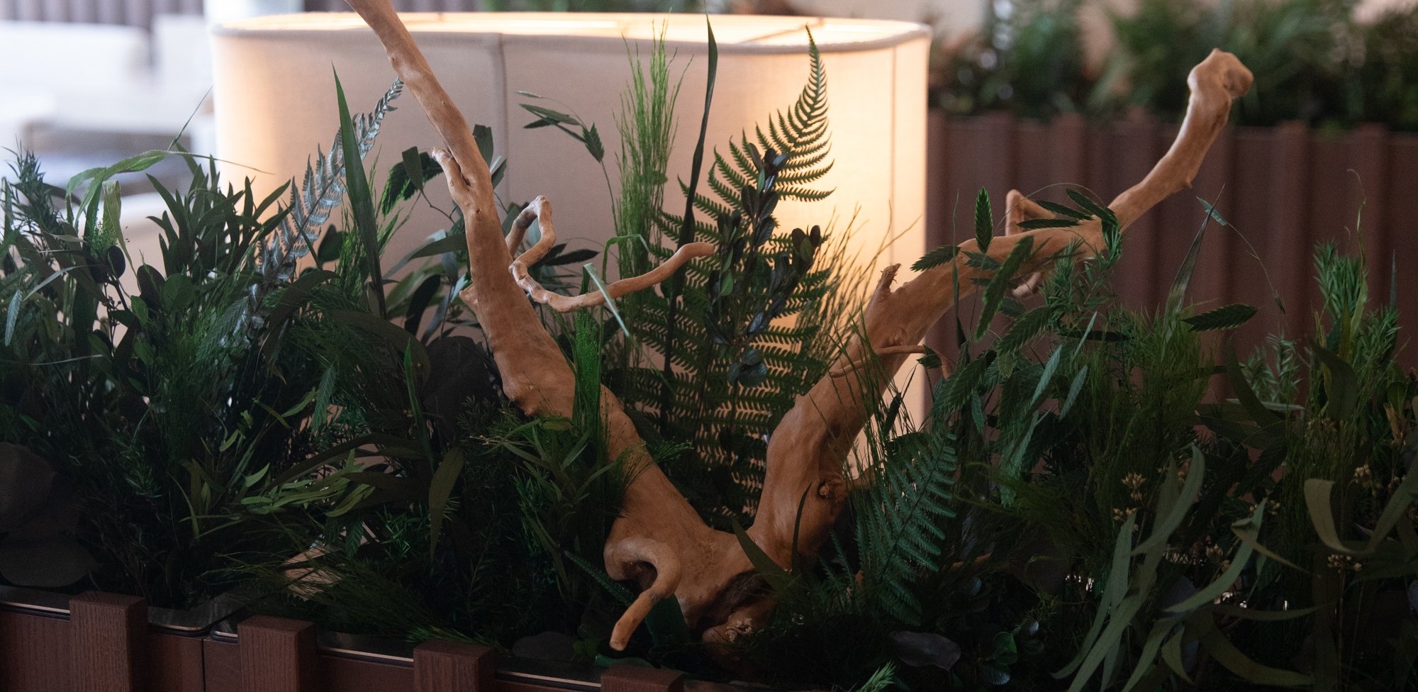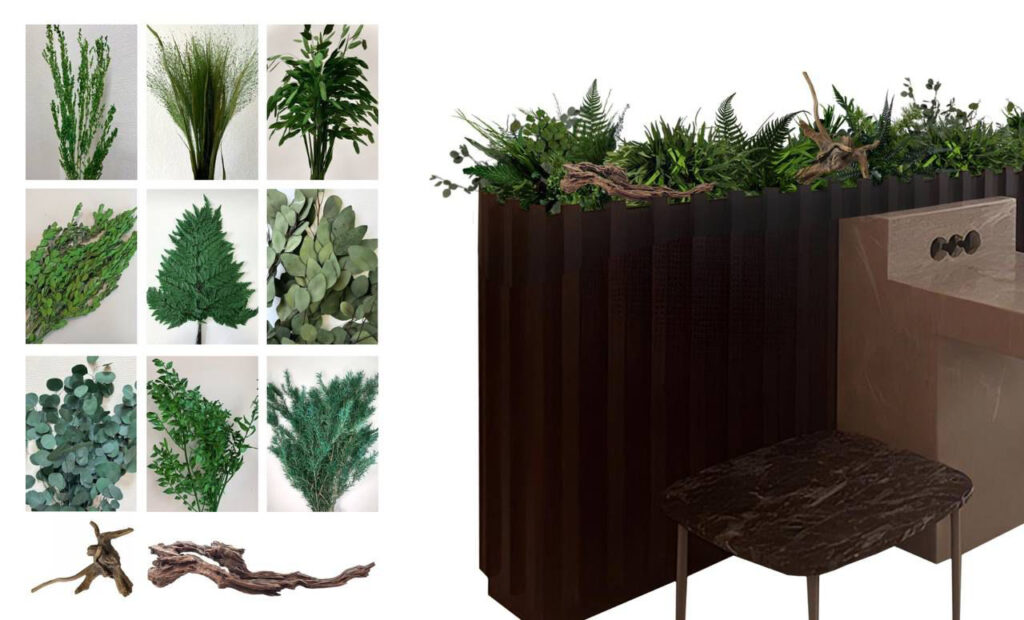 Подобранные флористами композиции обеспечивали требуемый эффект присутствия натуральной зелени без потребности регулярного полива, обрезки и особого ухода. Каждый компонент флористических композиций был выбран таким образом, чтобы создать ощущение настоящего сада: в работе использовались стабилизированное сорго, просо, плоскоколосник, эвкалипт популус, листья папоротника, самшит, рускус, чайное дерево, гревителлия, золотарник и корни мангрового дерева. На фото ниже представлен дизайн-проект для заказчика.