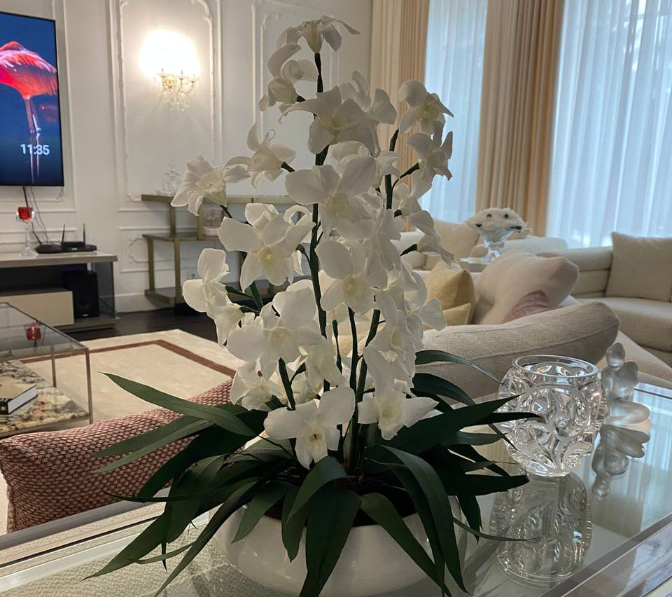 Еще одна композиция располагается на прозрачном стеклянном журнальном столике. Керамическое кашпо с пятью белыми веточками стабилизированной орхидеи цимбидиум. Нижняя часть кашпо заполнена удлинённой флористической зеленью, акцентируя тонкий контраст мягких форм и гладких поверхностей. Вся конструкция выглядит невероятно элегантно и естественно, наполняя гостиную тонким очарованием Востока и непередаваемым чувством уравновешенности.