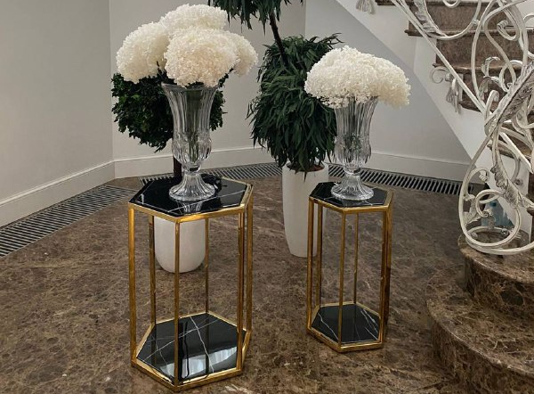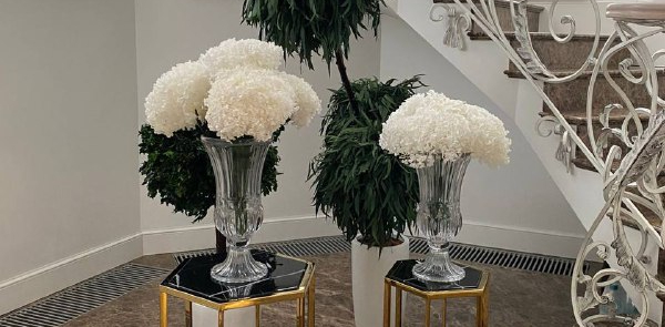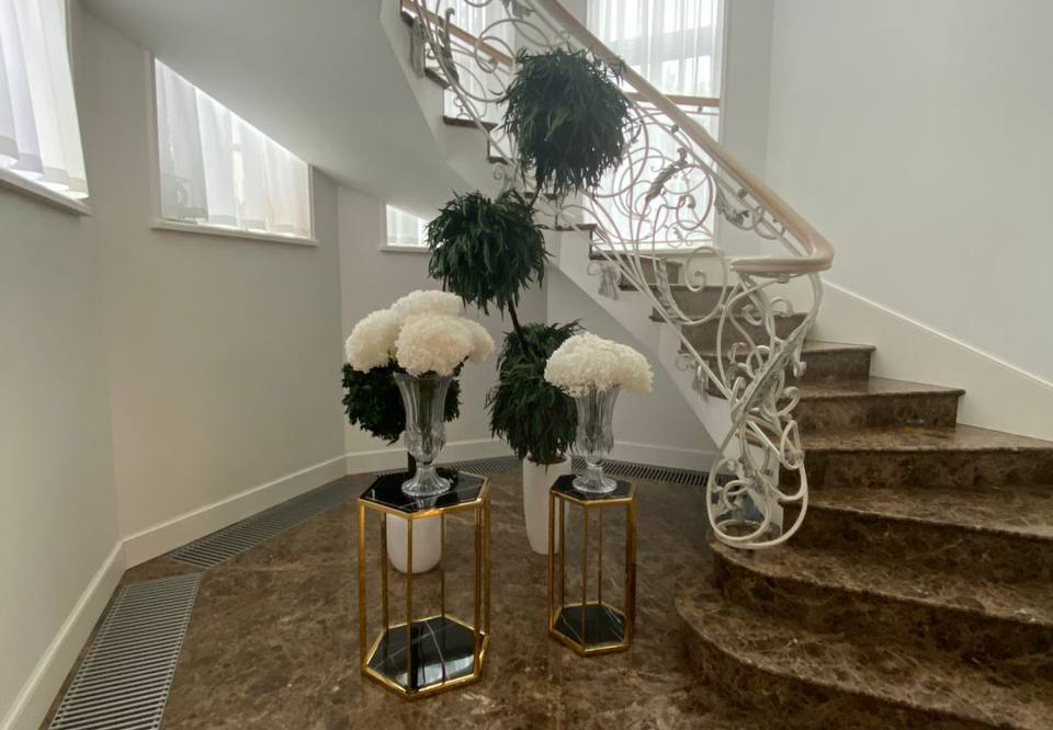 Но главным украшением композиции выступает пара флористических композиций из трех тонких веточек стабилизированной белой гортензии. Расположенные в высокие массивные стеклянные вазы из плотного стекла, они стоят на металлических круглых столиках, играя бликами света и создавая эффект воздушного объема. Тонкие белые головки гортензии мягко рассеиваются вокруг ствола лестницы, создавая впечатление лёгкого цветения в самом сердце интерьера.