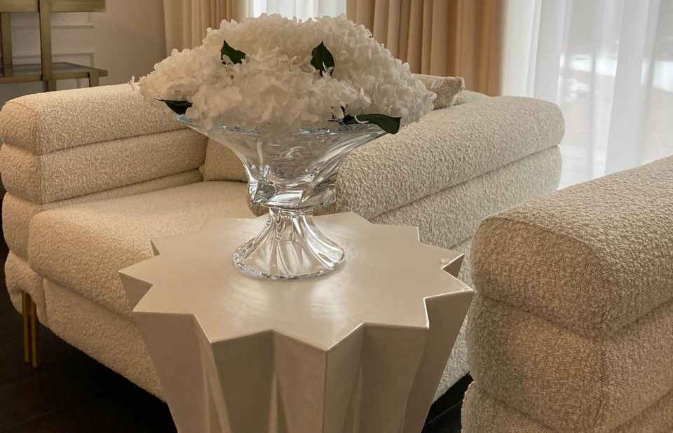 В гостиную Tamara Leman принесла два замечательных элемента декора, гармонично завершающих общее пространство. Широкая плоская ваза на ножке, наполненная нежнейшими соцветиями белой стабилизированной гортензии без стеблей. Кажется, будто весенний сад попал в ваш дом, заполнил пространство легкостью и чистым ароматом свежести. Эту лаконичную, но весьма эффективную композицию разместили на дизайнерской тумбе, ставшей важным штрихом в ансамбле обстановки.