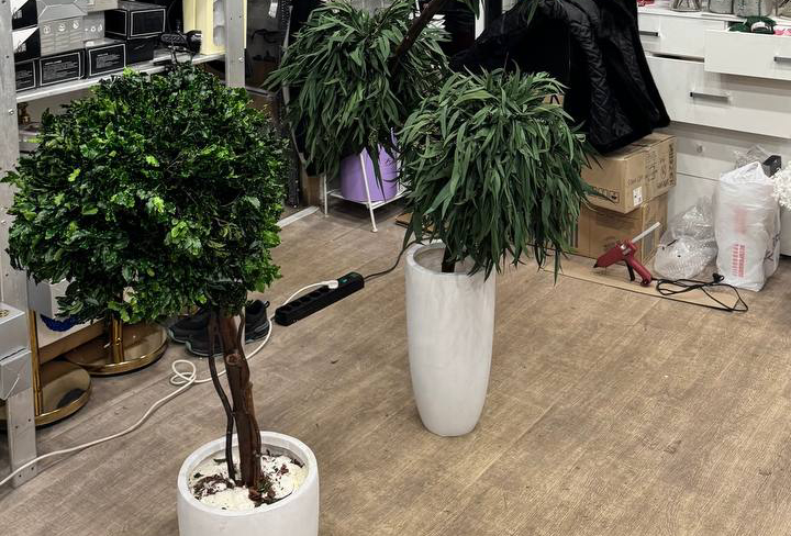 Рядом высится элегантный эвкалипт Николи, чьи четыре пушистых шара рассредоточены на ветках в оригинальном шахматном порядке. Легкая структура и воздушность куста добавляют интригу в верхние уровни холла, становясь приятным дополнением общего ансамбля.