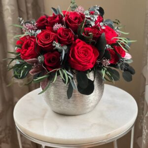TLK-386 Композиция из красных и бордовых роз в круглой металлической вазе
