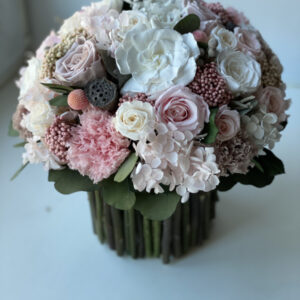 Композиция из стабилизированных цветов не обязательно должен быть помещен в коробку или вазу. Он может стаять на своих же стеблях. В руках умельцев розы, гибискус, пионы — превращается в великолепный букет. Нежные розовые и белые цветки словно застыли во времени. Они не завянут и не испортятся. Их не нужно поливать и подливать воду… они просто радуют глаз и украшают любое помещение.