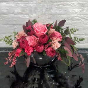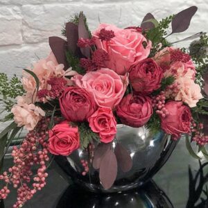 Состав: пионовидные стабилизированные розы, розы, эвкалипт, тысячелистник, папоротник адиантум люти, папоротник мингферн, ягоды.