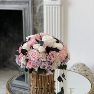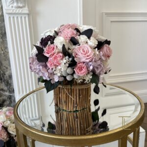 Изящный стабилизированный букет на стеблях. Розовый, сиреневый, белый — нарядные и изысканные цвета. Розы, гортензии прекрасно сочетаются с зелеными листочками. Мощное основание из стеблей, на котором стоит букет, дополняет композицию.
