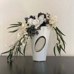 Стабилизированный букет из орхидеи, веточек гортензии и раскидистыми ивовыми прутиками. Удлиненные листочки на сгибающихся веточках ниспадают вниз, обрамляя невероятной формы вазу. Дизайнерская высокая ваза с полым отверстием посередине. Композиция однозначно привлечет внимание гостей.