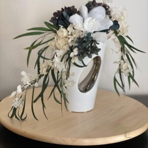 Стабилизированный букет из орхидеи, веточек гортензии и раскидистыми ивовыми прутиками. Удлиненные листочки на сгибающихся веточках ниспадают вниз, обрамляя невероятной формы вазу.