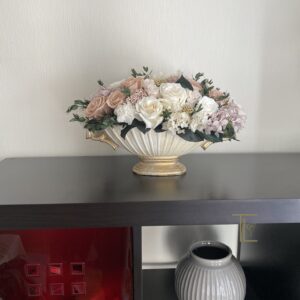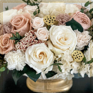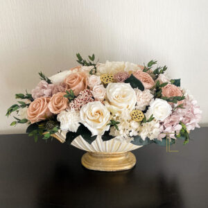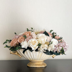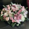 Композиция в нежных пастельных тонах прекрасно впишется в любой интерьер. Белые и бежевые розы, гортензии и приглушенная зелень создают единый образ сдержанного, изысканного букета. Горизонтальные цветы будут смотреться как на стойке ресепшн, так и на консоли или этажерке уютного домашнего интерьера.