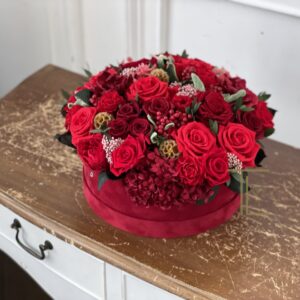 Велюровая коробка диаметром 40 см, розы, гортензии, зелень — единый образ великолепия и изысканной, утонченной красоты!