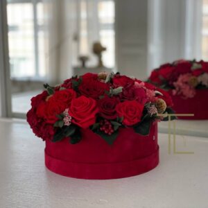 Композиция из стабилизированных алых роз в шляпной коробке — элегантный подарок для прекрасной представительницы слабого пола. Сочетание красного и бордового делает букет привлекательным и романтичным. Композиция будет прекрасной точкой притяжения для всего интерьера комнаты.