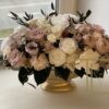Букет из роз, пионов и гортензии в великолепном золотом вазоне. Прекрасный вариант для прихожей в гостинице или доме.