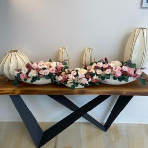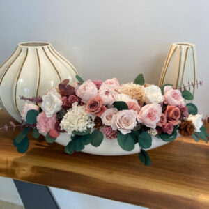 Композиция из стабилизированных цветов в большой ладье словно олицетворяет бегущую по волнам лодочку. Пионовидные розы белого, кремового, бардового цвета уютно расположились на борту. Они не завянут и не испортятся. Им не нужен уход. Они просто плывут и дарят наслаждение.