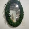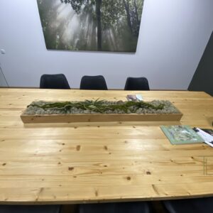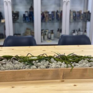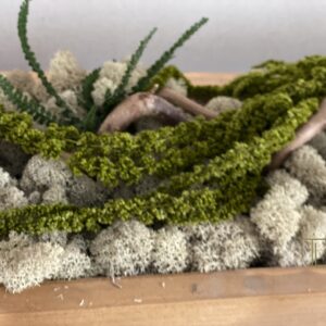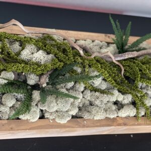 Белый и зеленый мох с листьями папоротника и голыми ветками корелиуса. Деревянный длинный ящик не окрашен, что придает композиции дополнительную естественность.