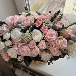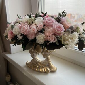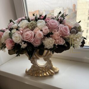 Большая композиция из розовых и белых роз с веточками зелени. Золоченая продолговатая ладья с нетривиальным дизайном подойдет для украшения помещения в стиле классицизма, барокко или ампир. Букет составлен из плотно прилегающих друг к другу бутонов на небольших веточках. Стебли не видны. Из ладьи видны бутоны, из которых составлена полусфера, заполняющая все пространство вазы. Композиция подойдет для стола переговоров или обеденного стола гостиной. Стабилизированные цветы изготавливаются по особой технологии, которая позволяет растениям оставаться свежими и не вянуть в течение нескольких лет. Получается значительная экономия на тратах на декор помещений.