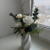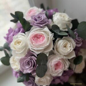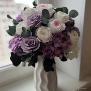 Прекрасный сиренево-бежевый букет в авторской вазе. Микс из пионовидных бутонов роз с классическими розами, эвкалиптом и гортензией. Композиции собираются под заказ в течение 1-2 дней. Стабилизированные цветы изготавливаются по особой технологии, которая позволяет растениям оставаться свежими и не вянуть в течение нескольких лет. Получается значительная экономия на тратах на декор помещений.