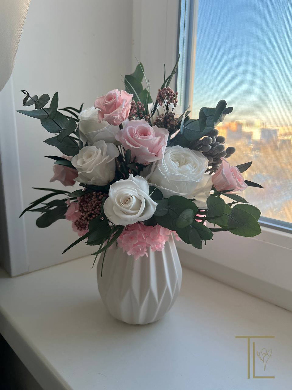 TLK-307 Композиция в бело-розовых тонах с эвкалиптом в белой вазе