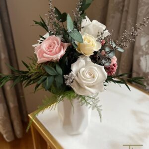 Мини букет из стабилизированных роз и зелени в белой вазе. В составе 7 бутонов разного размера. 3 розовых и 3 белых бутона среднего размера, 1 желтый мини бутон.