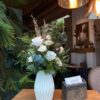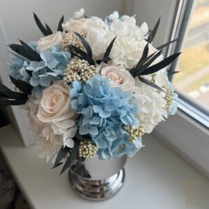 Композиция из кремовых роз белой и небесно-голубой гортензии