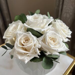 Стабилизированный букетик из роз и веток эвкалипта. В композиции 7 бутонов белоснежных роз. Белая круглая вазочка с рельефом. Прекрасный подарок на 8 марта или просто в качестве знака внимания.