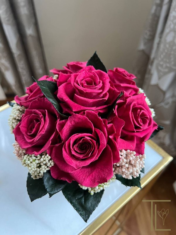 TLK-16 Мини композиция из стабилизированных роз с гарденией и ветками цинерария