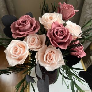 Композиция из 9 стабилизированных роз в вазе с эвкалиптом. Ваза входит в комплект.