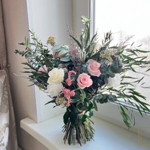 Стабилизированная композиция из роз трёх оттенков (белый, молочный и молочно-розовый), бутоны трёх размеров (мидл, мини и медиа). В составе 15 бутончиков и разнотравье.