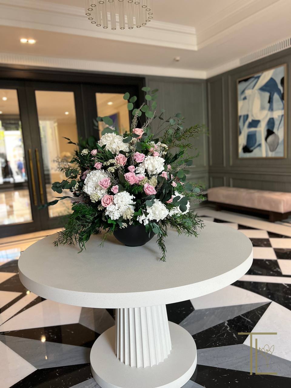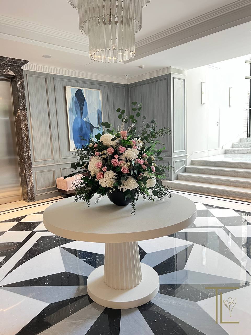 Стабилизированные цветы в холл элитного дома на Малой Бронной. Предварительные согласования по дизайну букета и по подбору вазы. Срок сборки букета — от 7 до 14 дней.