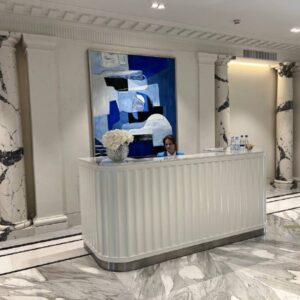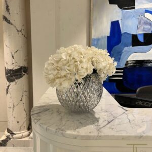 Шикарная композиция на ресепшн. В составе 3 гортензии белого цвета. Вазу заказчик приобретал самостоятельно. Высоту цветов готовили под вазу. Срок изготовления 1-2 дня.