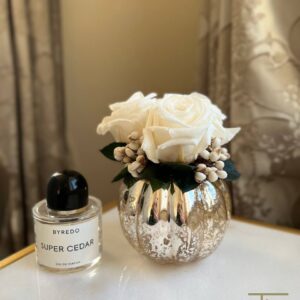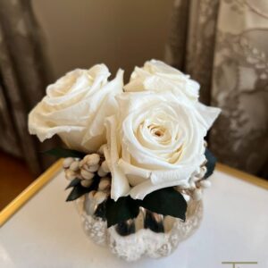 Мини букетик из стабилизированных бутонов роз. 3 белых соцветия с зеленью. Вся зелень в букете тоже стабилизированная! Миленькая круглая вазочка с зеркальным покрытием дополняет композицию.
