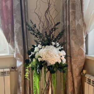 Цветы — это неотъемлемая часть любого интерьера, они создают особое настроение и притягивают к себе внимание. Напольная композиция из роз и гортензии. Ветки создают объем и рельеф букету. Высокая прозрачная ваза в виде колбы.