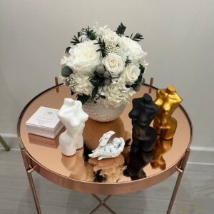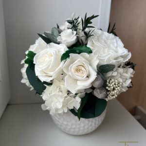 Стабилизированный мини букетик для журнального столика или ресепшн. В составе 11 роз (3 стандартных+6 мидл+2 мини), гортензия и декоративная зелень.