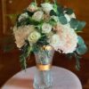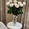 В составе: роза «панакота» — 7шт, роза «смоки пинк» — 8 шт, зелень эвкалипта — 9 веток, ваза талия стекло 20 см.