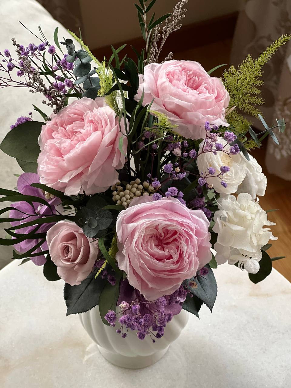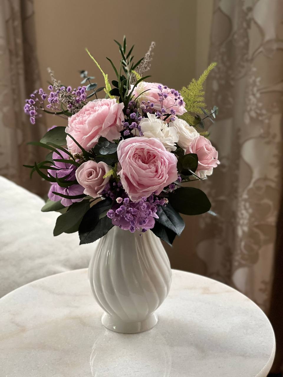 Перед вами букет, который сочетает в себе элегантность и утонченность. В центре композиции расположены стабилизированные пионовидные розы, чьи нежные лепестки сохраняют свою свежесть и красоту на протяжении долгого времени. Их окружают воздушные облака гортензии, добавляющие объема и мягкости. Нежные веточки гипсофилы придают букету легкость и романтичность, а изумрудная зелень завершает композицию, создавая гармоничный и сбалансированный образ. Все это великолепие помещено в стильную керамическую вазу, которая подчеркивает изящество и утонченность букета, делая его идеальным украшением для любого интерьера.