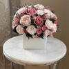 Изысканная композиция из стабилизированных белых роз разной величины и степень раскрытия, а также сочетание зелени различной фактуры.