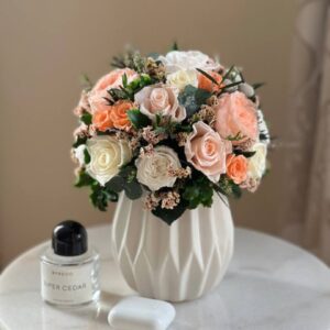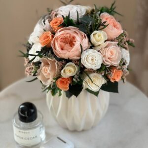 Композиция из стабилизированных роз нежно-персикового оттенка в белоснежной вазе станет прекрасным украшением любого интерьера, принося с собой атмосферу романтики и утонченности.