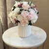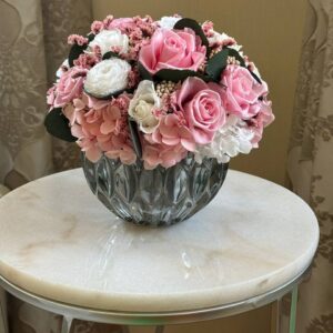 Букет из розовых и белых роз с гортензией и зеленью в круглой стеклянной вазе. Украсит стол в столовой, ванную комнату или гостиничные апартаменты. Компактная композиция из стабилизированных цветов будет радовать постояльцев несколько лет. Бутоны обычных и пионовидных роз мини и мидл размера. Гортензия и рисовый цветок (озотамнус) дополняют композицию.