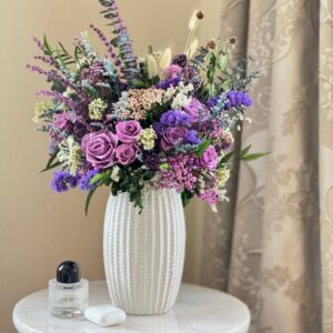 Букет из стабилизированных цветов в белой вазе из керамики – это прекрасное решение для интерьера или подарок, который принесет радость и украсит вашу жизнь без необходимости заботы о цветах.