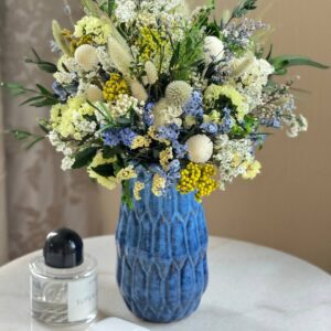 Букет создает настроение свежести утреннего луга. Только что собранные в охапку полевые цветы поставлены в великолепную голубую вазу, которая сама по себе уже является произведением искусства. Разнотравье, разноцветие — все это в одном букете. Такая композиция украсит прикроватную тумбу или кухонный стол за городом, в деревне.