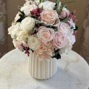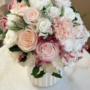 Великолепная композиция из стабилизированных роз и гортензии в неповторимом бело-розовом цвете. Композиция помещена в белую керамическую вазу.