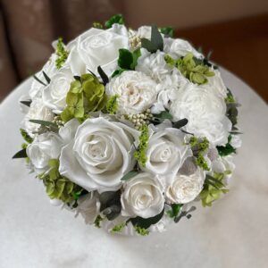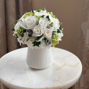 Нежная композиция из стабилизированных роз мини и стандартного размера, белой и зеленой гортензии и зелени. В составе 19 бутонов роз, гортензия и зелень. Такой очаровательный букет подойдет для украшения банкетного стола, ресепшн или гостиничного номера. Оригинальная вазочка дополняет композицию. Ваза входит в стоимость композиции.