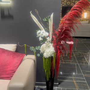 Фееричная напольная композиция «Nuvola rossa» — это не просто цветочное украшение, а настоящее произведение искусства. Каллы, орхидеи прошли специальный процесс стабилизации, который позволяет им выглядеть свежими и живыми на протяжении многих лет, при этом не требуя никакого ухода. Напольная ваза добавляет композиции элегантности и легкости. Таким образом, этот букет не только обогащает интерьер, но и становится центральным элементом любого пространства, будь то гостиная, спальня или офис.