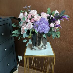 Очаровательный нежный букет из розовых роз, калл, и сиреневой гортензии в стеклянной вазе. Букет украшен зеленью в виде эвкалипта. Букет не только визуально очаровывает своей красотой, но и создает особенную атмосферу нежности и романтики. Композиция из розовых роз обещает принести радость и тепло в сердца всех, кто её увидит. Это элегантный и романтичный букет, который олицетворяет нежность, восхищение и любовь.