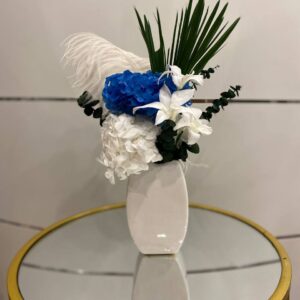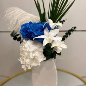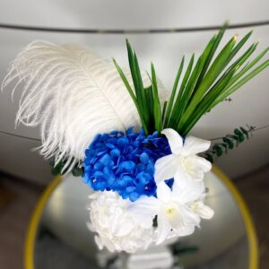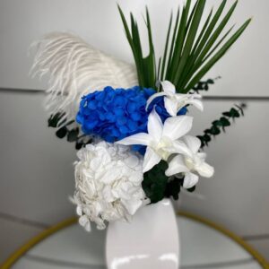 Композиция из роз, перьев и стабилизированной зелени. Красивый акцент интерьера для столиков в ресторане, кафе, гостинице или дома. Букет не только визуально очаровывает своей красотой, но и создает особенную атмосферу нежности и романтики. Каждый элемент букета подобран со вкусом.