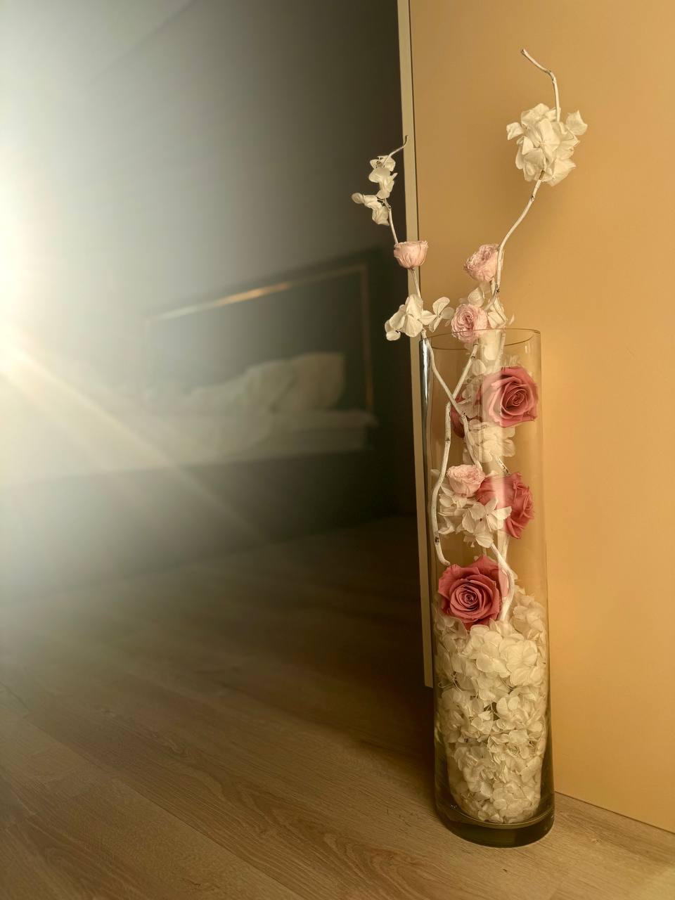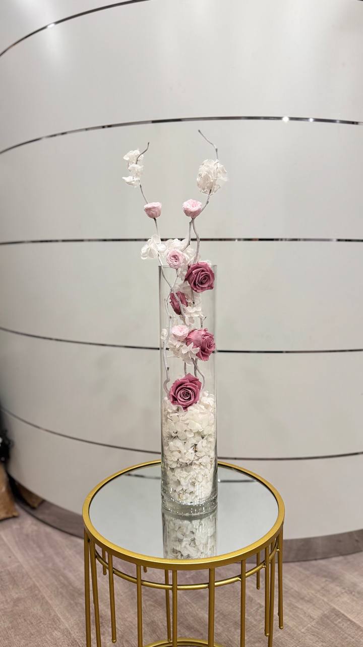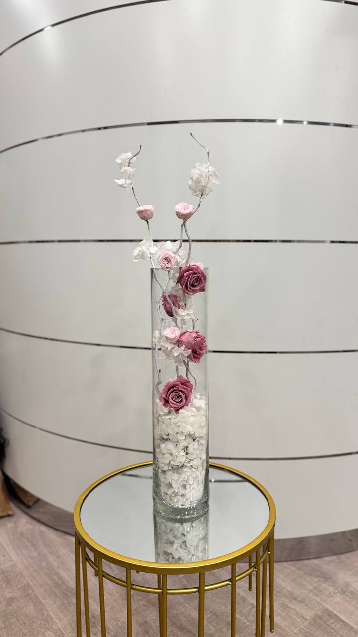 Эта прекрасная композиция представляет собой удивительное сочетание стабилизированных роз и гортензии, размещенных в прозрачной стеклянной колбе. Колба, словно магическое окно в мир цветов, позволяет насладиться красотой и изяществом каждого цветка. Цветы укреплены на стеблях, которые образуют красивую спиральную форму, придающую композиции особую элегантность. Белые и розовые оттенки цветов создают нежное и романтичное настроение. Эта уникальная композиция является идеальным подарком или украшением для любого интерьера, добавляя в него штрихи красоты и изысканности.