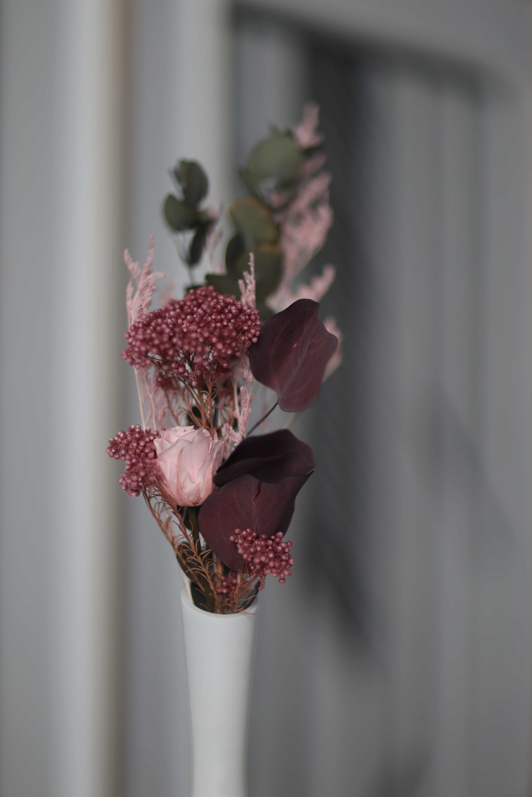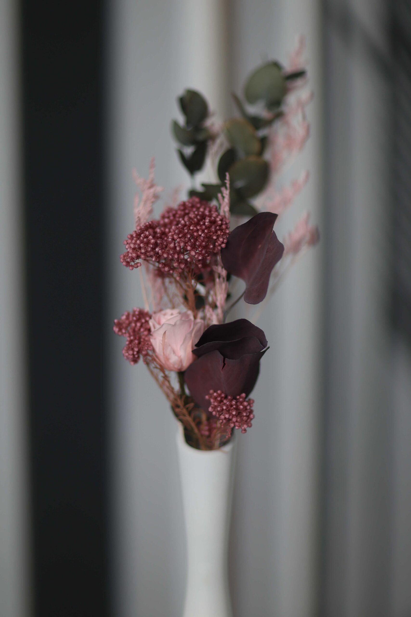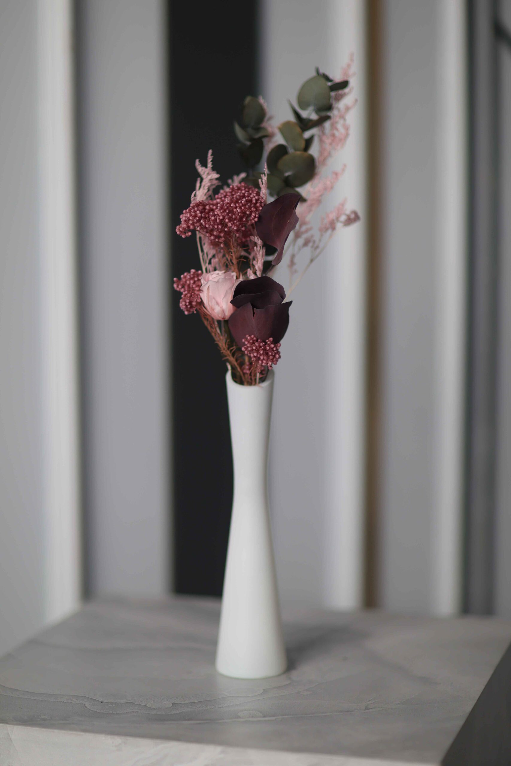 Роскошная композиция включает в себя прекрасную розовую розу, богато бордовую зелень и эвкалипт, которые были стабилизированы для сохранения своей естественной красоты и свежести. Букет представлен в высокой белой вазе, что добавляет ему элегантности и изысканности. Композиция идеально подходит для украшения гостиниц и домов, создавая роскошную атмосферу и придавая интерьеру изысканности. Розовая роза, символизирующая любовь и красоту, станет ярким акцентом в помещении, привлекая внимание и создавая неповторимую атмосферу. Бордовая зелень и эвкалипт добавят глубину и текстуру, создавая идеальное сочетание цветов и форм.