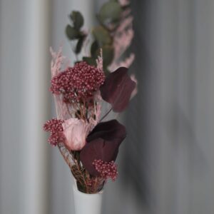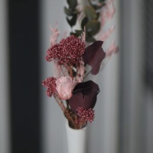 Роскошная композиция включает в себя прекрасную розовую розу, богато бордовую зелень и эвкалипт, которые были стабилизированы для сохранения своей естественной красоты и свежести. Букет представлен в высокой белой вазе, что добавляет ему элегантности и изысканности. Композиция идеально подходит для украшения гостиниц и домов, создавая роскошную атмосферу и придавая интерьеру изысканности. Розовая роза, символизирующая любовь и красоту, станет ярким акцентом в помещении, привлекая внимание и создавая неповторимую атмосферу. Бордовая зелень и эвкалипт добавят глубину и текстуру, создавая идеальное сочетание цветов и форм.