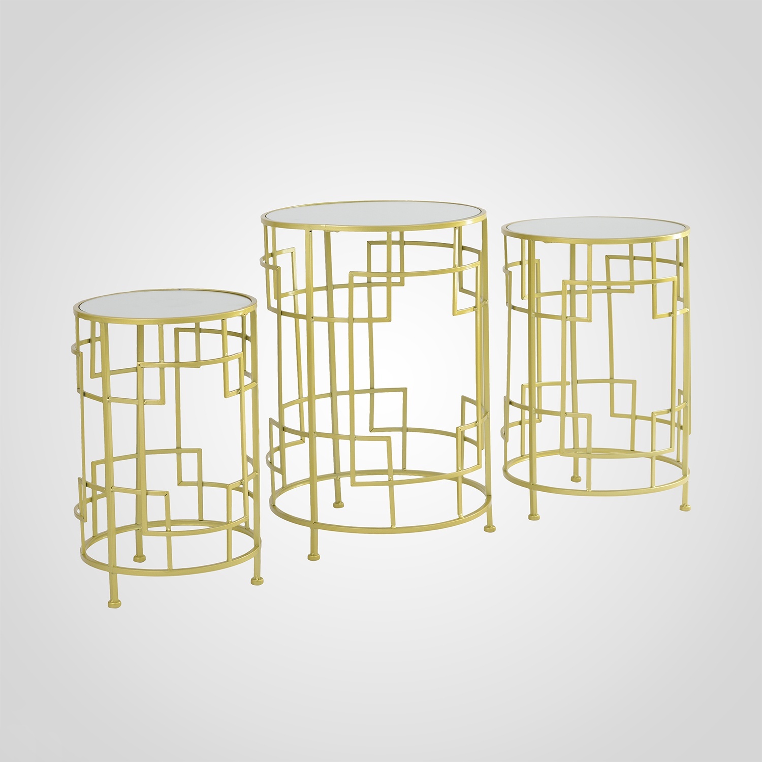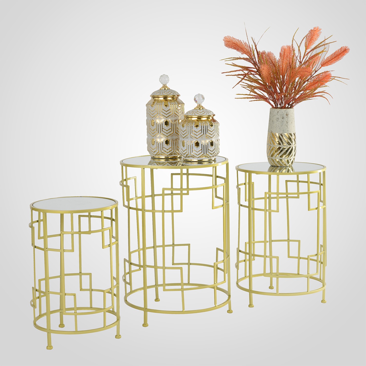 Добро пожаловать в наш интернет-магазин, где вы найдете набор из трех круглых подставок «Абстрактные линии» в золотистом цвете. Эти подставки, сделанные из прочного металла и стекла (зеркала), являются настоящим произведением искусства. Их золотистый оттенок придает им роскошный и изысканный вид, который будет прекрасно сочетаться с другими элементами вашего интерьера. Круглая форма подставок придает им элегантность и стиль.