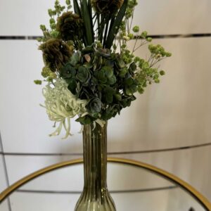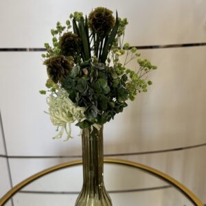 Загляните в зеленый рай с композицией из стабилизированных цветов. Зеленая гортензия, астра, гипсофила и папоротник располагаются в стеклянной вазе, повторяя игру солнечного света в лесной чаще. Благодаря стабилизации, цветы сохраняют свежесть и форму на долгие месяцы, не требуя ухода. Миниатюра украсит любой интерьер, наполнив его гармонией и жизненной силой. Это идеальный способ принести природу домой и создать уют.