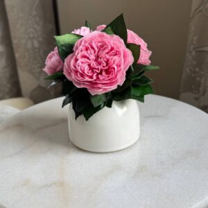 Подарите интерьеру нежность и элегантность с миниатюрной композицией из трёх стабилизированных пионовидных роз нежного розового цвета. Дополнительный шарм придают ветки стабилизированной зелени, расположенные в оригинальной керамической вазе.