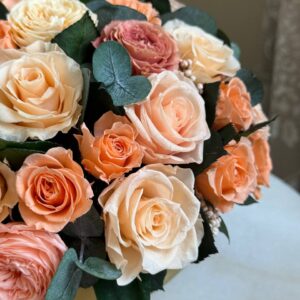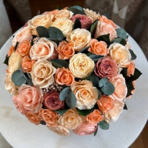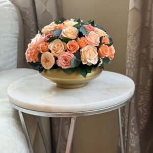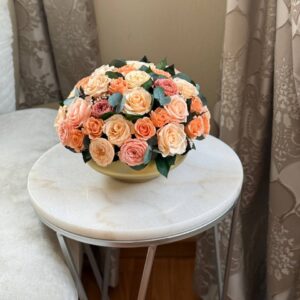 Погрузитесь в состояние гармонии и спокойствия с композицией из стабилизированных чайных роз. Чайные розы, сформированные в аккуратную сферу, установлены в низкой металлической вазе золотистого цвета, добавляющей композиции роскоши и изысканности.